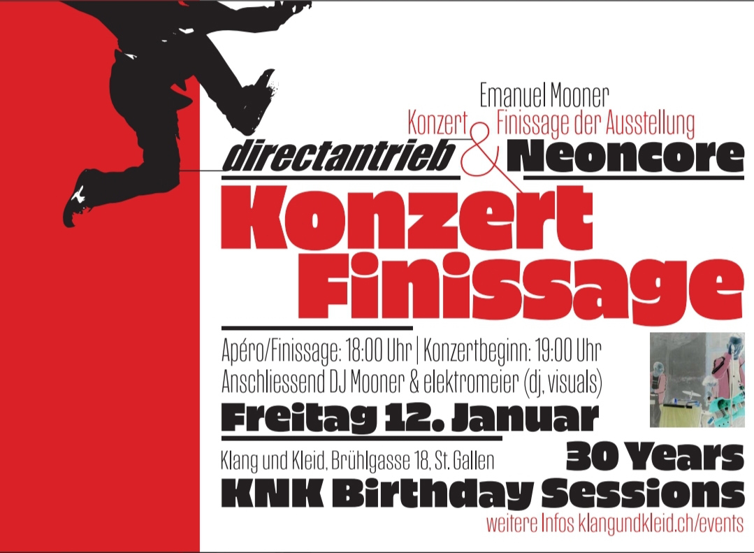 ![]() Konzert DIRECTANTRIEB (CH)Die Band DIRECTANTRIEB begeisterte Anfang der 2000er Jahre das Publikum in St. Gallen mit ihren legendären Live-Auftritten! Anlässlich der Finissage von Emanuel Mooner's Ausstellung treten sie nun in Originalbesetzung mit Pablo Pacios, Michael Schädler und Georg Neufeld, im schaurig schönen Gewölbekeller von KNK exklusiv nochmals auf!DJ Mooner (DE)Aka Emanuel Mooner wird ein Set an den Turntables oder auf seinem Notebook spielen! Ende der 90er Jahre begeisterte Emanuel Mooner mit seiner Band Zombienation das Electro/Techno und House-Publikum weltweit mit dem Ohrwurm und Hit Kernkraft 400. Der Song und Refrain wird noch heute in den grossen Sportstadien der NFL und NHL in den USA zur Anfeuerung der Teams gespielt und hat seinen Wiederverwendung in vielen Racing-Games und 1000en Remixes gefunden!![]() elektromeier (CH)Aka Patrick Jost, lokale "Elektrogrösse" im wahrsten Sinne aus St. Gallen, wird uns an diesem Abend ebenfalls als DJ und mit seinen generativen Visuals beehren! Elektronisch durch und durch, verspielt, speziell! Enjoy :)![]() Finissage "Neoncore" Ausstellung (DE)Die Werke von Emanuel Mooner machen Reste, Überbleibsel, Schrott, zu Kunst. Seine Objets Trouvé bestehen aus zwei Elementen: Neonröhren, die einst Reklametafeln zierten, und verformte Karosserieteile von Unfallfahrzeugen. Beide Elemente kann man nicht mehr ohne Weiteres ihrem ursprünglichen Zweck zuordnen, doch wirkt ihre spontane Form in der Kombination beabsichtigt. Unvollständige Buchstabenteile werden auf Blechreste von Unfallwägen montiert und erleuchten die verbeulte und vernarbte Oberfläche.Die grellen Neonröhren wecken dabei ganz widersprüchliche Ambitionen: Zum einen erinnern sie den Betrachter an ihren ursprünglichen Zweck, an ihr früheres Dasein als grell leuchtende Symbole unserer Konsumgesellschaft, andererseits verändern sie die Wahrnehmung und lassen auf dem Blech hinter dem Licht neue Formen und Strukturen Gestalt annehmen. Dadurch entsteht eine industriell anmutende Ästhetik, bei der die Form keiner Funktion mehr zuzuordnen ist.