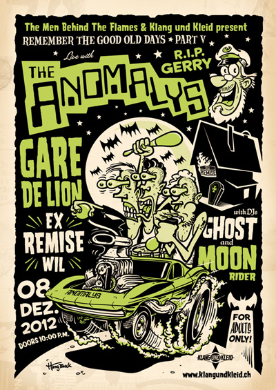 ![]() Plakat kaufen Remember The Good Old Days... Part VLasst uns erneut am Samstag den 8. Dezember den alten Remise Tagen gedenken. Seit 2008 gibt es den Anlass Remember The Good Old Days im Gare de Lion in Wil/SG. Einmal im Jahr lässt man die legendären Remise Tage der 90er hochleben und rockt was das Zeugs hergibt. Dies in den vergangenen Jahren mit The Staggers und Batman & Robin aus Österreich, The Monsters und Men from S.P.E.C.T.R.E. aus der Schweiz und dieses Jahr mit The Anomalys aus Holland.In den letzten Jahren haben The Anomalys in der Ostschweiz sich einen legendären Ruf für ihre wilden Auftritte hart erarbeitet. Das NEGATIVE TEQUILA ROCK'N'ROLL SEX Trio spielt 100% Drag-Strip-Garage-Punkrock und dies auf, vor und neben der Bühne... also genau dort wo wir dich an diesem Abend ebenfalls sehen wollen. 60s, Surf Sounds kommen vom DJ Duo Ghost & Moonrider Jeden Besucher erwartet wie die letzten Jahre ein Offset-Druck Poster